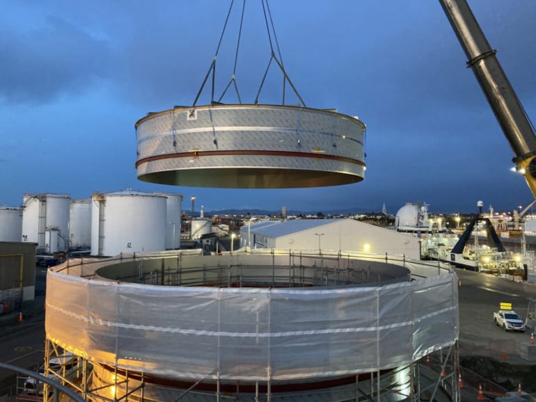 Each of the tank’s five stainless steel tiers was fabricated off site and then transported to site for installation. Each tier was craned into position and welded by a team of local contractors. The roof, preassembled in a nearby workshop, was delivered on a house-moving trailer and then lifted onto the top of the tank.